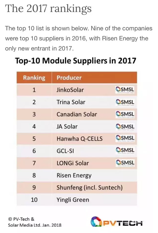排在前10位的分別是:晶科、天合光能、阿特斯、晶澳、韓華、協(xié)鑫、隆基樂葉、東方日升、順豐清潔能源、英利。